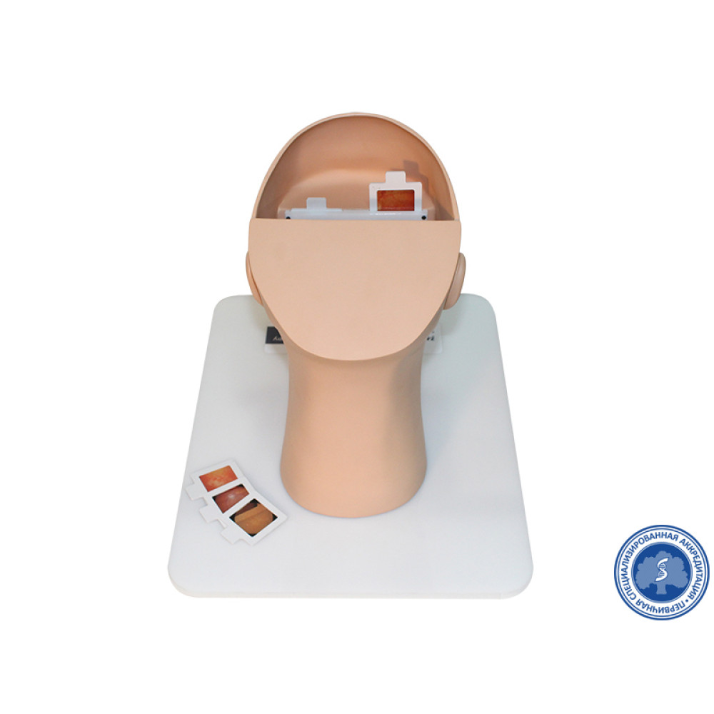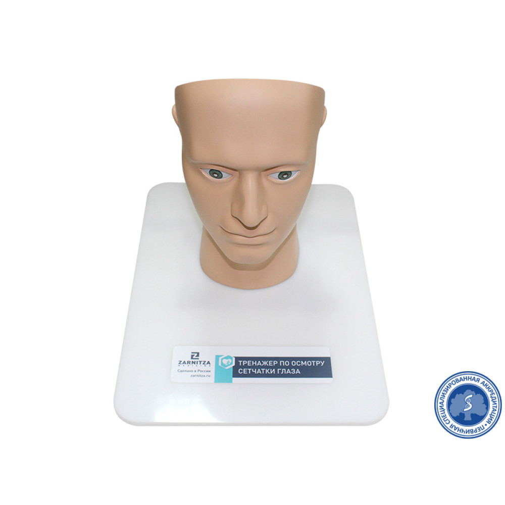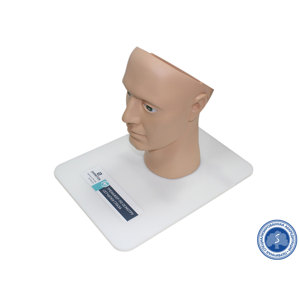 Представляет собой модель головы человека на подставке с реалистичными передними отделами глаз. Тренажер предназначен для отработки навыков диагностики патологии сетчатки глаза. Позволяет с помощью офтальмоскопа производить имитацию осмотра сетчатки. Изображения передаются с помощью сменных слайдов, находящихся на месте заднего отдела глаз.