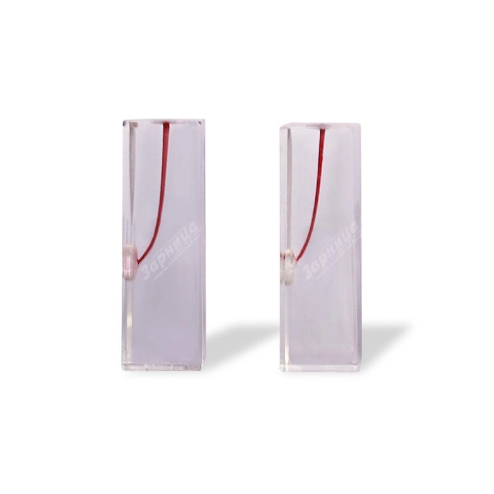 Комплект эндоблоков представляет собой набор из прозрачных прямоугольных блоков с искривленными на 20 и 30 градусов корневыми каналами, боковым выходом и стенками, окрашенными в красный цвет.