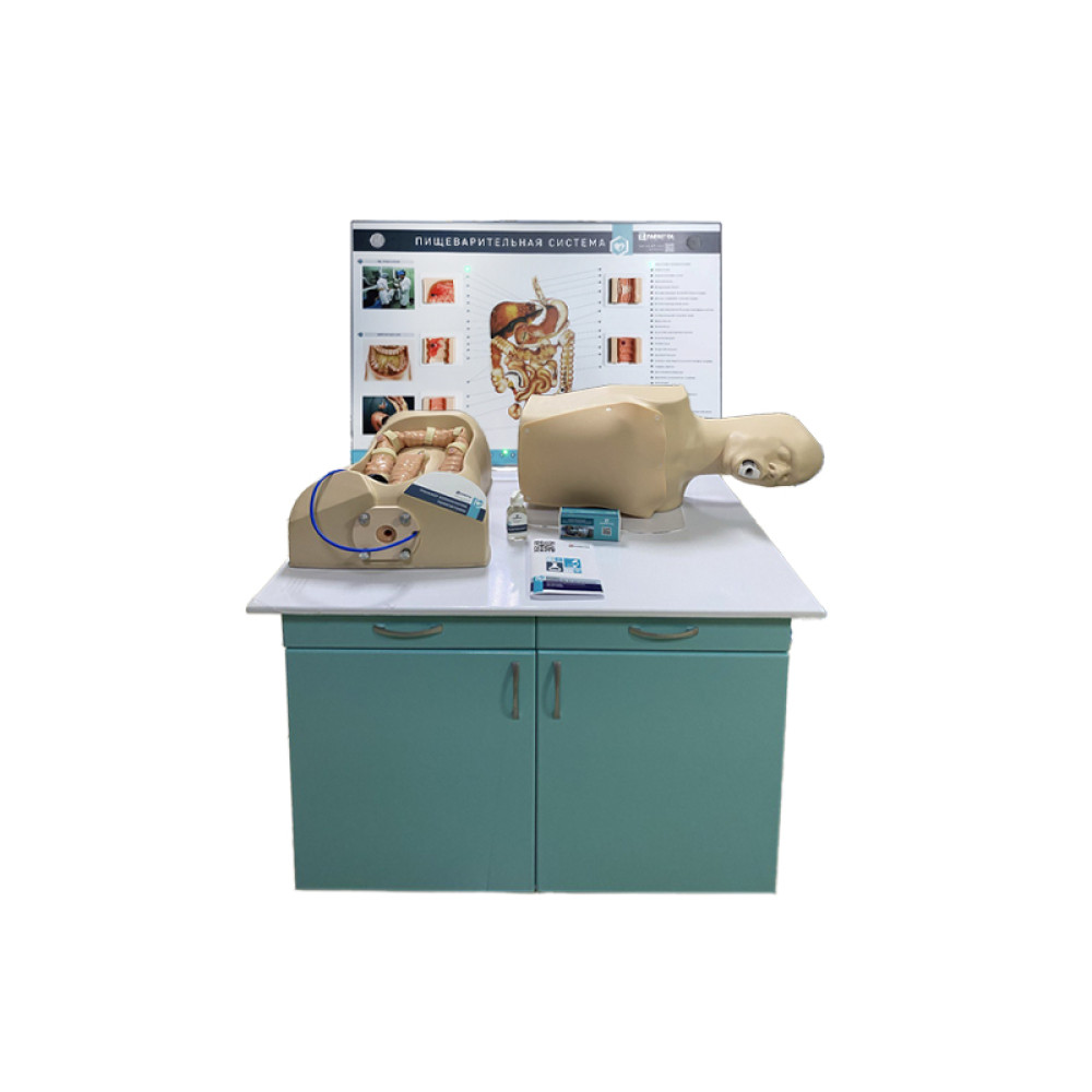 Внутренние органы изготовлены максимально реалистично для получения достоверной картинки на эндоскопах. Тренажер предназначен для отработки навыков эзофагогастродуоденоскопии (ФГДС) с возможностью катетеризации Фатерова соска и колоноскопии. Реализована возможность визуального контроля за прохождением эндоскопа и катетеризацией Фатерова соска. Тренажер комплектуется съемными органами с нормальной анатомией и патологическими изменениями. Сменные органы выполнены из силикона, имитирующего ткань человеческого тела. В комплект поставки входит интерактивный светодинамический модуль с макетными образцами различных заболеваний. В конструкции учебного оборудования интегрированы высокочувствительные сенсоры для управления стендом при помощи интерактивного воздействия приемо-передающих устройств. Оборудование оснащено программным обеспечением "Виртуальный учитель", громкость которого изменяется при помощи сенсорного регулятора, расположенного на лицевой панели.