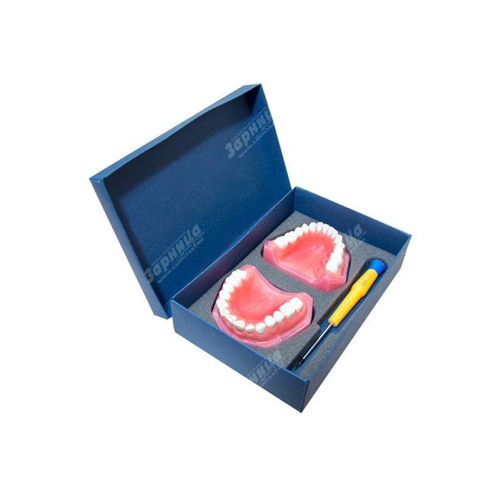 Представляет собой денто-модель верхней и нижней челюстей с эластичной десной, анатомически соответствующую зубочелюстному аппарату взрослого пациента. Смыкание реализовано в стабильной окклюзии, с комплектом из 28 модельных зубов. Предназначена для отработки навыков анестезии и терапевтических манипуляций. Все зубы съемные и фиксируются при помощи винтов с внутренним пазом типа "звезда", позволяющим избежать срыва шлица при многократной замене модельных зубов. На торцах денто-моделей имеются специальные пазы для установки окклюдатора. Для быстрого монтажа в стоматологические фантомные головы денто-модель снабжена монтажной пластиной.