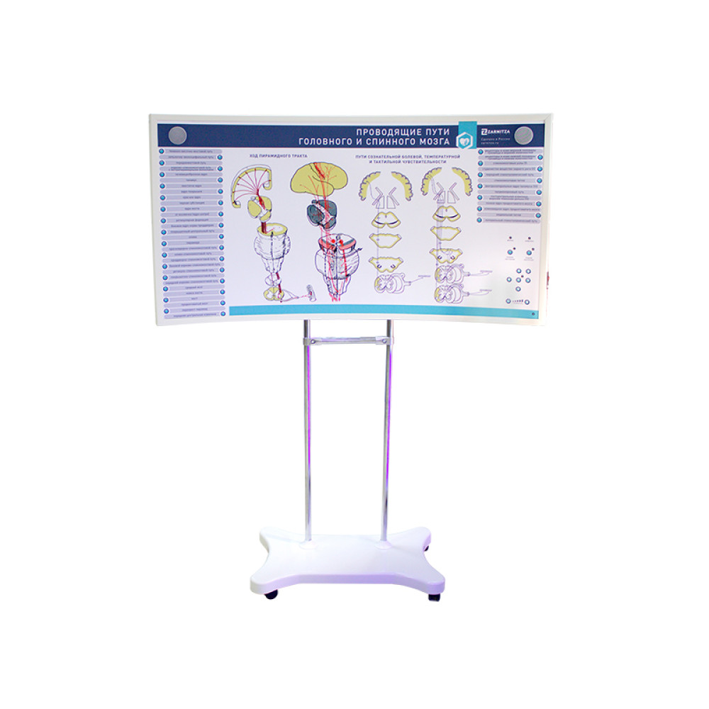 Учебное наглядно-демонстрационное обеспечение комплекса включает в себя светодинамический интерактивный стенд-панель, позволяющий изучить двигательные проводящие пути, пути сознательной болевой, температурной и тактильной чувствительности. Предусмотрено два режима работы со стендом: "Обучение" и "Контроль". В режиме "Обучение" на панели управления касанием сенсора выбирается та или иная анатомическая структура или проводящий путь, при нажатии на который световая индикация подсвечивает данную позицию, а программное обеспечение "Виртуальный учитель" воспроизводит голосовое сопровождение. В режиме "Контроль" программный код управления генерирует случайный вариант вопроса и подсвечивает ту или иную позицию стенда, при правильном или неправильном выборе ответа загорается соответствующая принятым стандартам светодиодная индикация.