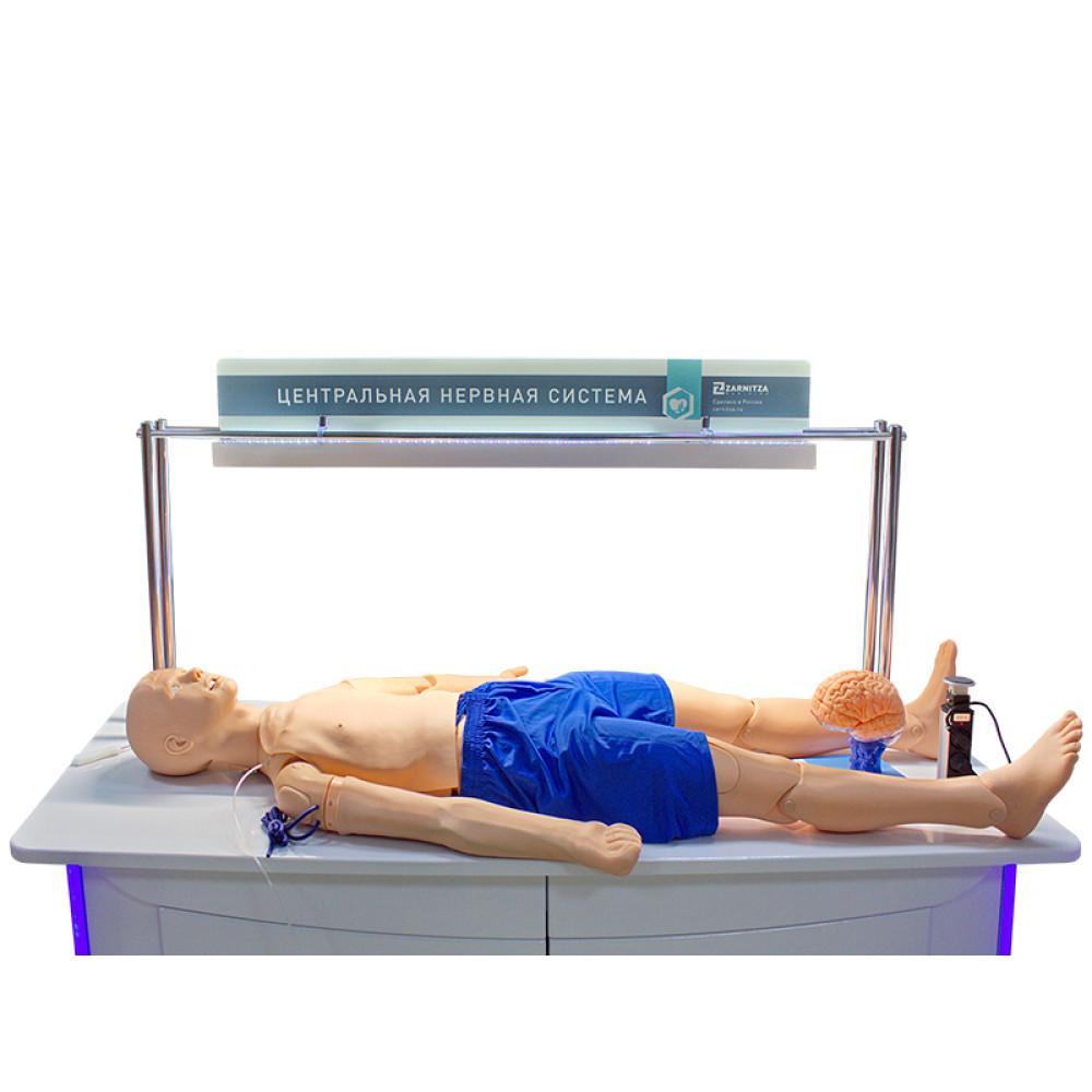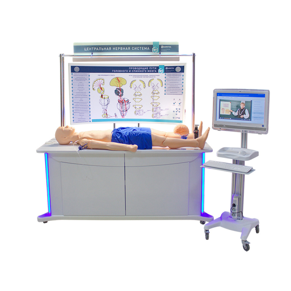 Представляет собой универсальный комплекс учебных тренажеров и методических пособий, позволяющих изучить теоретический материал, отработать практические навыки, производить контроль полученных знаний в области неврологии. Учебно-методический комплекс включает в себя тренажеры для отработки практических навыков в области неврологии, моноблок, размещенный на стойке, многофункциональный комплекс с системой хранения комплектующих, светодинамический интерактивный стенд, разборную модель головного мозга, сегмент спинного мозга.