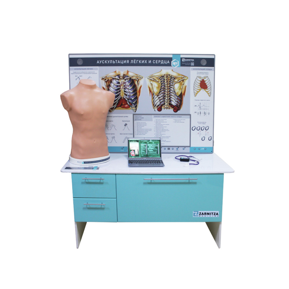 Тренажер аускультации представляет собой модель торса человека, предназначенную для отработки базовых практических навыков физикального осмотра (аускультация и пальпация). В комплектацию тренажера входит ноутбук . В стандартных точках выслушивания, которые поочередно подсвечиваются диодами с помощью программы, расположены сенсоры, при прикладывании к которым головки стетоскопа программное обеспечение генерирует заданную аудиограмму, характерную для той или иной патологии. В ПО тренажера предусмотрен режим контроля: по прослушанной аудиограмме испытуемый должен поставить диагноз, который соответствует аускультативной картине.
