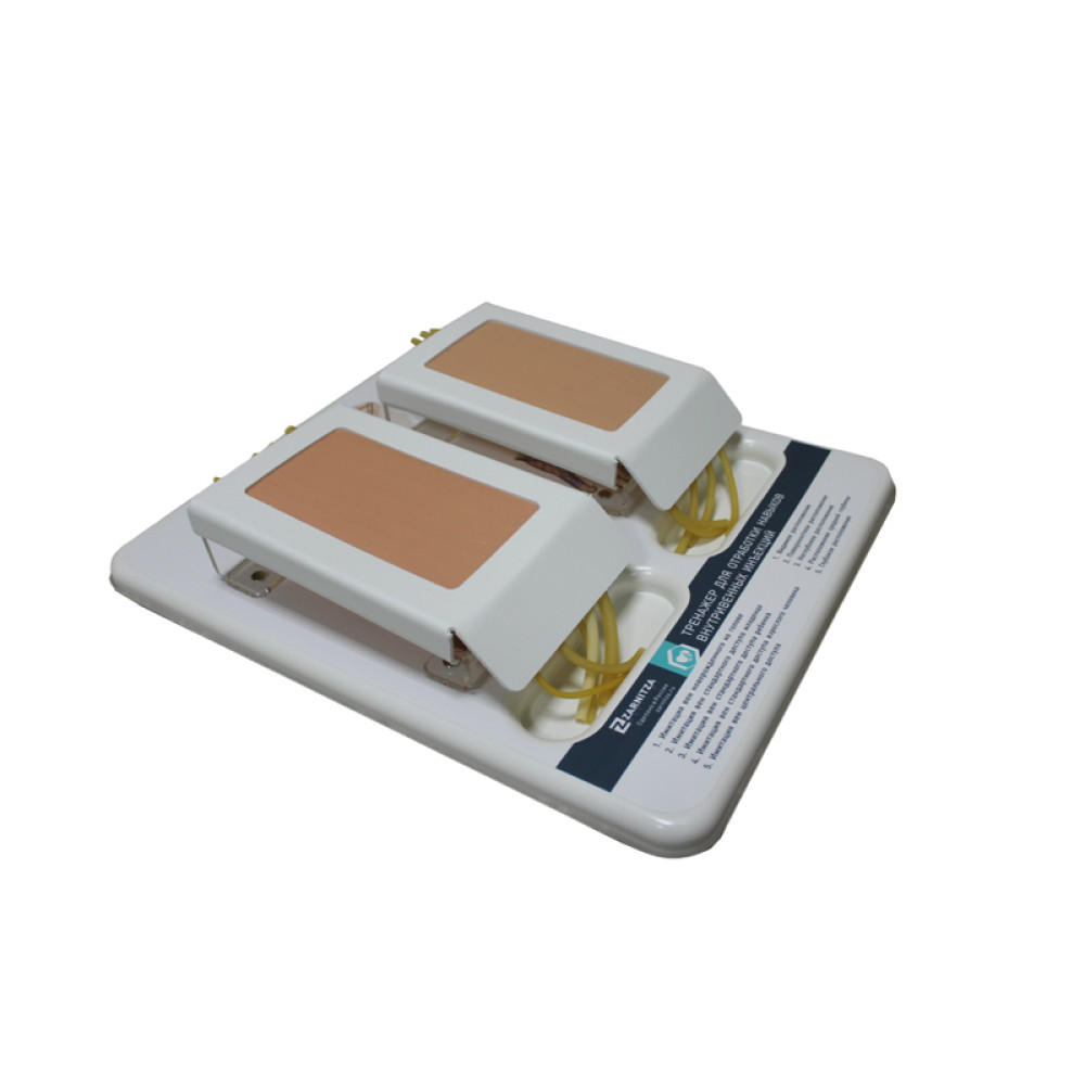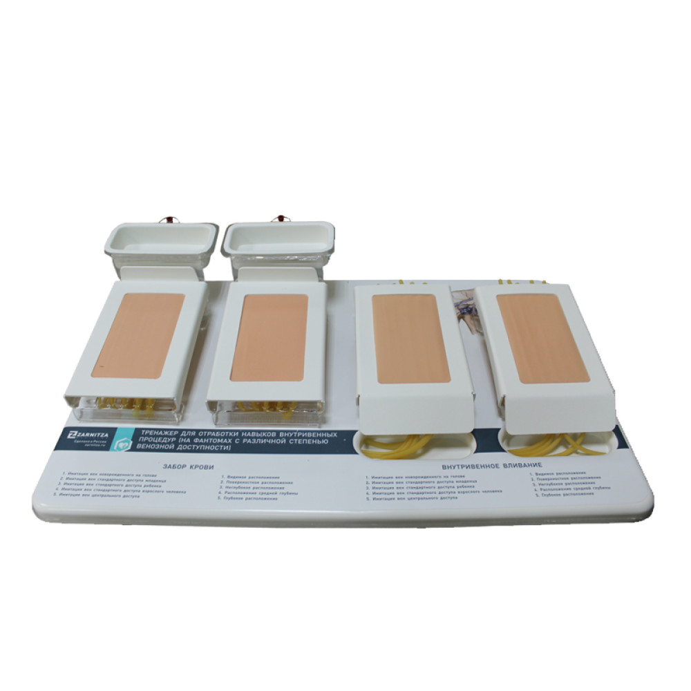 Тренажер представляет собой полноцветную панель, с установленным на ней четырьмя имитаторами участков кожи и подкожной клетчатки. Предназначен для отработки навыков двух видов медицинских процедур: внутривенных инъекций и забора крови в разных условиях доступности сосудов.