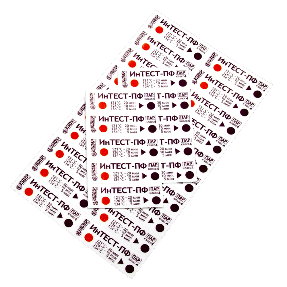 Индикаторы ИНТЕСТ-ПФ предназначены для оперативного визуального контроля соблюдения критических переменных паровой стерилизации – температуры стерилизации, времени стерилизационной выдержки и наличия насыщенного водяного пара в паровых стерилизаторах по ГОСТ Р 51935-2002 (EN 285-95) и EN 13060-2011.