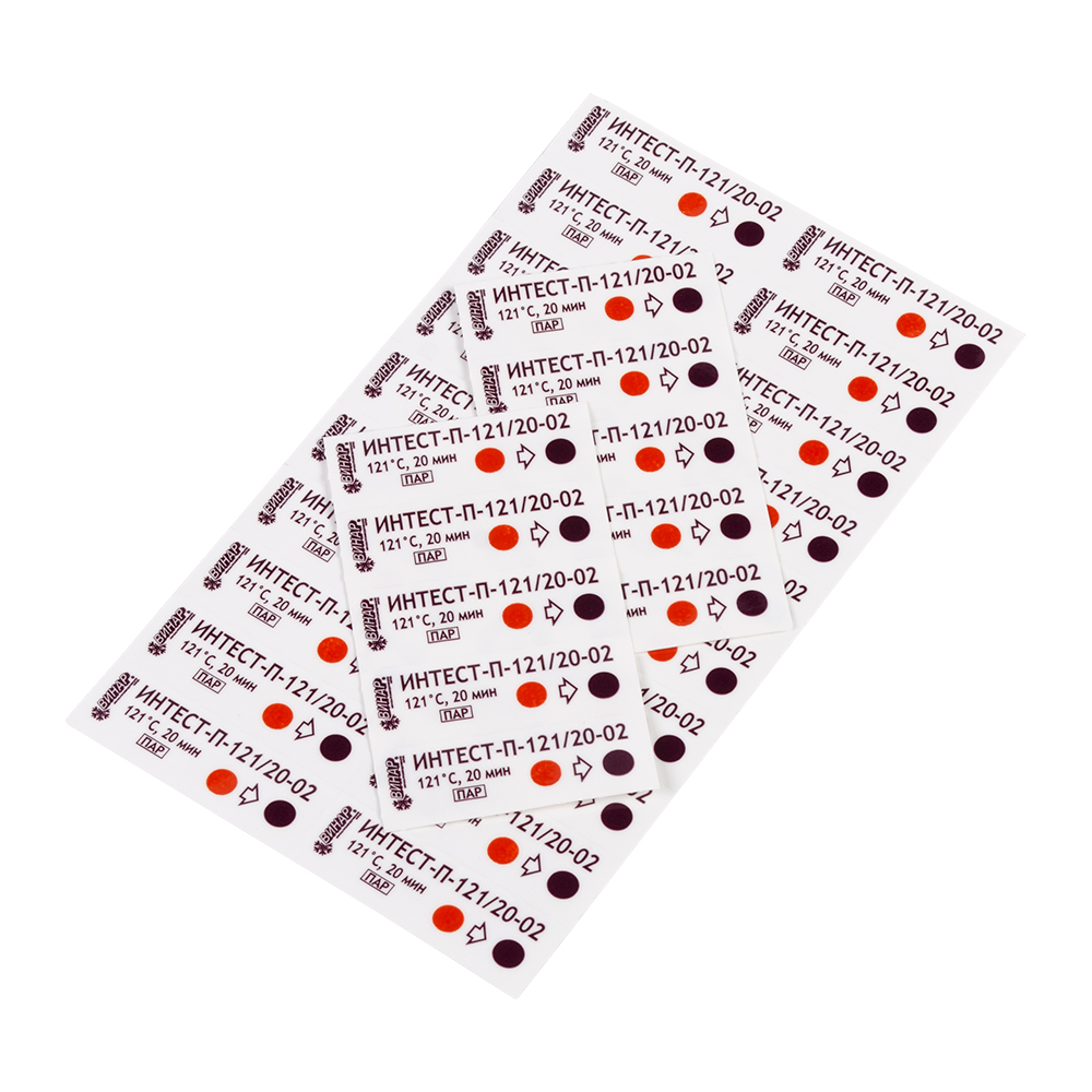 Индикаторы «ИНТЕСТ-П-121/20-02» предназначены для оперативного визуального контроля соблюдения критических переменных паровой стерилизации – температуры стерилизации, времени стерилизационной выдержки и наличия насыщенного водяного пара – в паровых стерилизаторах с удалением воздуха из стерилизационной камеры методом многоступенчатого вакуумирования.