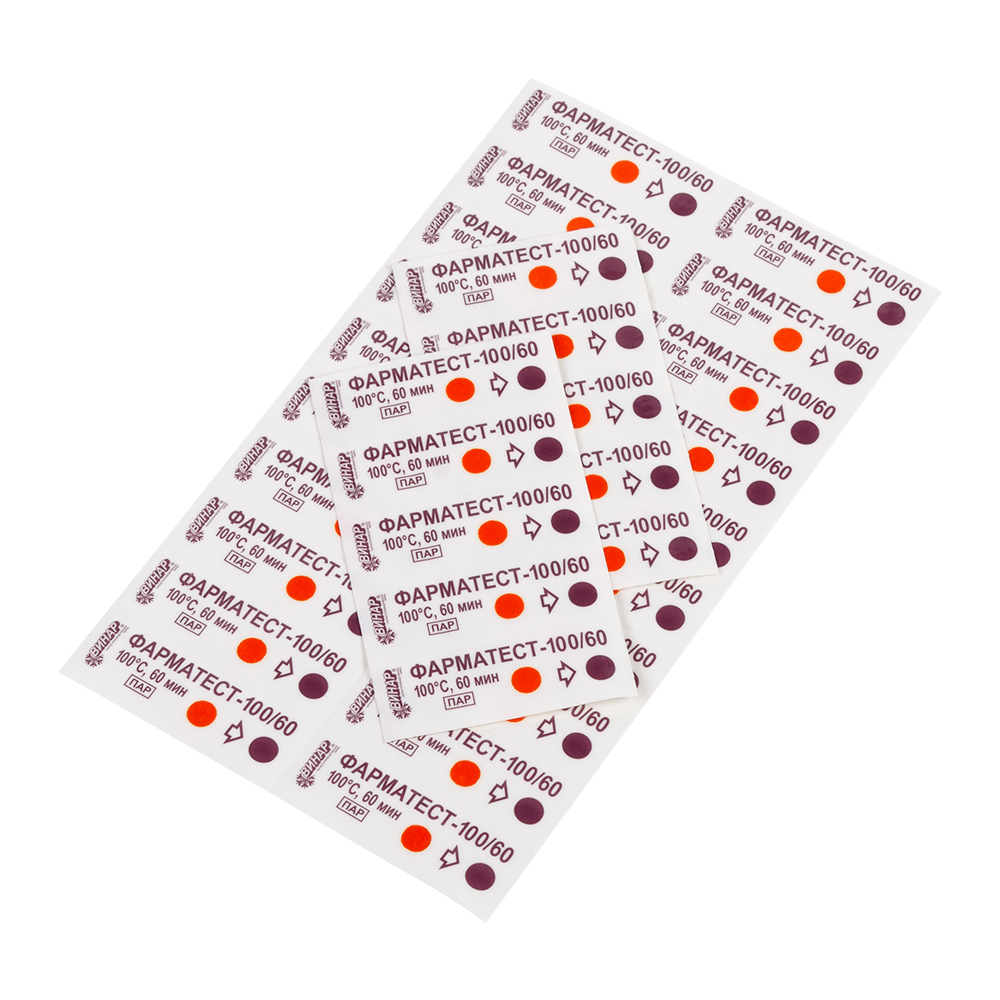 Индикаторы Фарматест-110/60 предназначены для оперативного визуального контроля соблюдения критических переменных процесса паровой стерилизации водных растворов – температуры стерилизации, времени стерилизационной выдержки и наличия