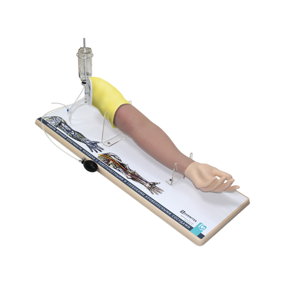 На подставке тренажера изображена сетка вен и артерий, что способствует изучению анатомии верхней конечности, также имеется кронштейн для установки емкости с имитатором крови.